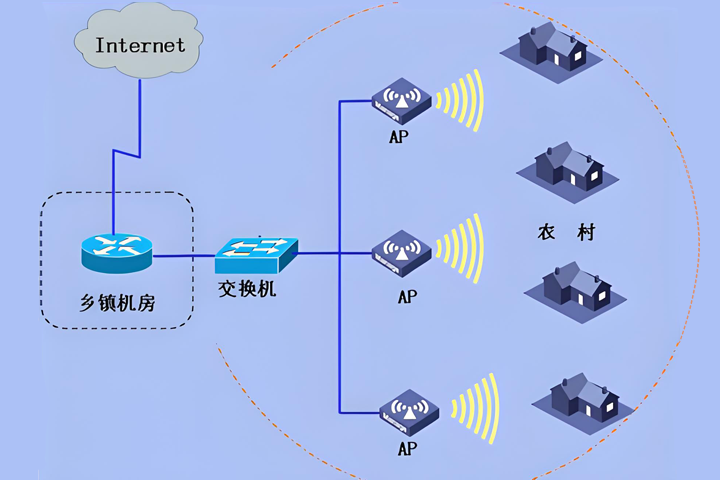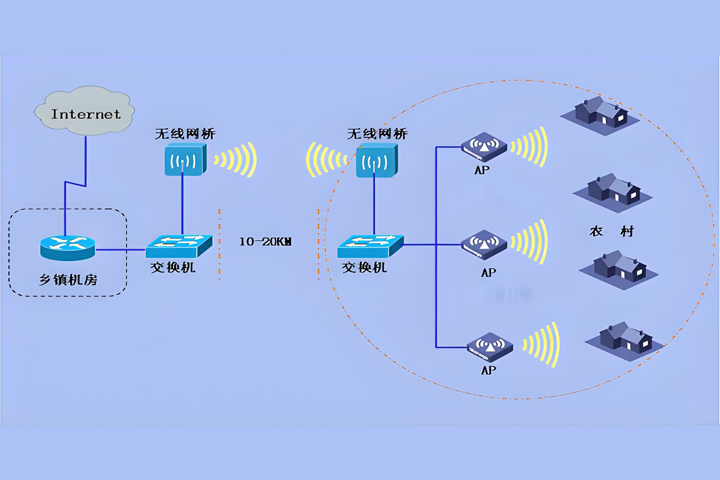 無線技術的成熟與發展在越來越多的場合得到推廣及應用,并得到各大運營商的青睞運用到各種場合,隨著農村的發展,人們生活水平的逐漸提高,對上網需求有著更大的提高。然而,農村地域廣闊,地形環境復雜多樣,居住地間距離較遠且分散,網絡建設的投資水平和消費水平的限制等等諸多困難,制約著農村信息化建設的發展。農村一般人口居住均在方圓3公里范圍內, 且高層建筑較少, 房屋多為磚木結構建筑。根據無線微波的特點,選擇合適的制高點架設無線設備并配合合適的接收終端,在半徑5公里范圍內能夠達到高穩定性高速率無線鏈路,完全滿足農村用戶上網需求,無線寬帶業務在農村有著不可比擬的優勢:建網成本低、一次性投入資金少、運營與維護成本低、建網速度快、高可靠性與超強的可擴展性,不僅可以為農民提供方便、快捷、費用低廉的寬帶入戶方式,也非常適應農村網絡建設逐步發展的需求。