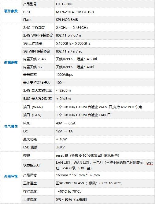 產品特點產品簡介 HT-G3200雙頻無線大功率AP可同時工作在2.4GHz/5GHz兩個頻段,支持900Mbps 11AC(5GHz)和300Mbps 11N(2.4GHz),支持最大接入100+,最高無線速率可達1200Mbps,可接入更多無線客戶端,解決能源行...