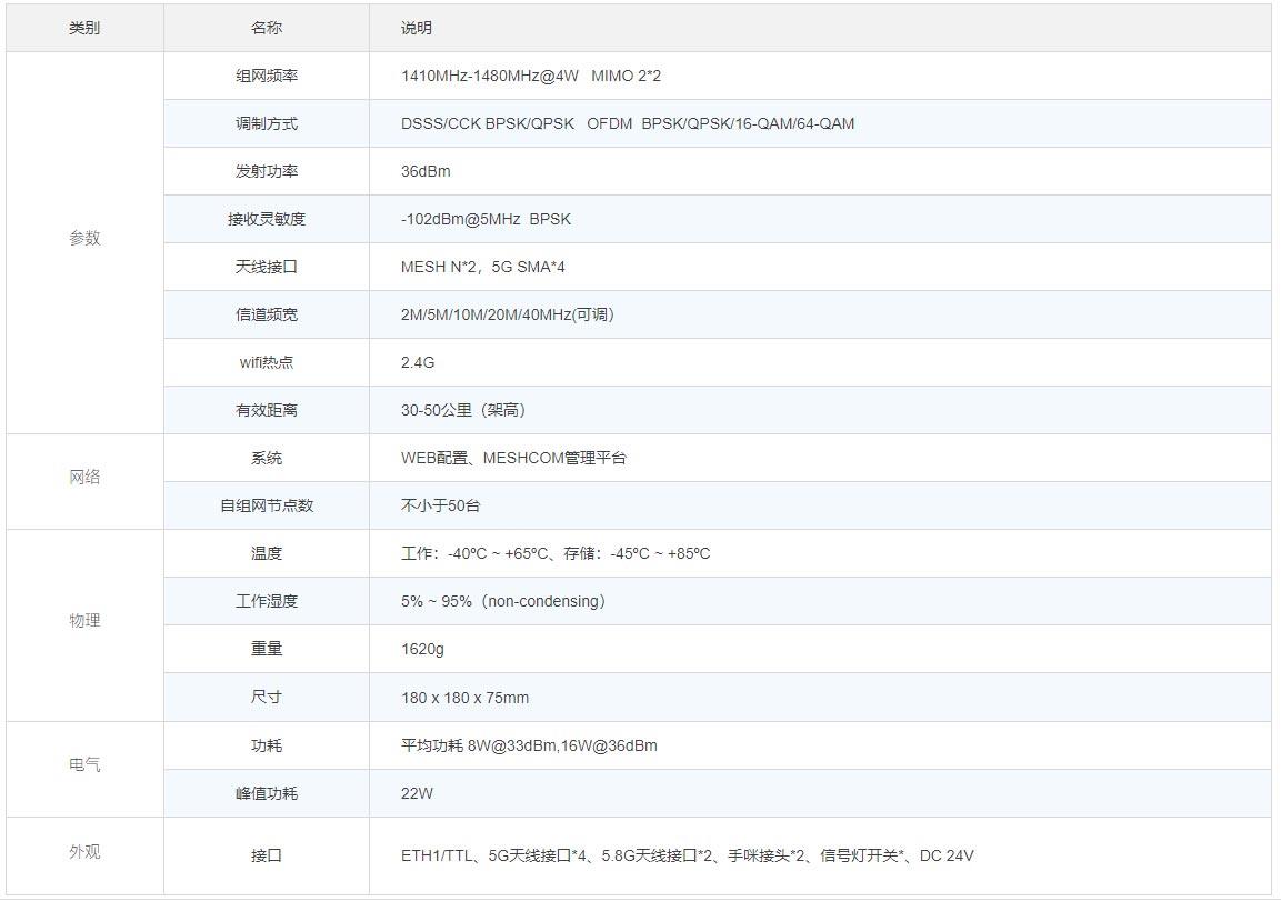產品特點產品說明HT-1400-5G是一款1.4G無線自組網模塊,支持MIMO高性能自組網功能,無中心的多跳組網方式、多點對多點的寬帶無中心自組網無線網絡;支持2.4G WIFI,支持PTT語音,支持HDMI高清輸入,非常適用于現場情...