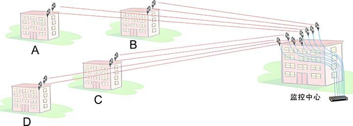 從A、B、C、D四個匯聚點傳輸至監控中心機房,由于考慮到每個匯聚點都已經匯聚了大約20路的高清圖像,所占用的帶寬已經比較大,所以20路圖像匯總到2個交換機,每個交換機使用一臺骨干級的無線網橋進行點對點傳輸,每個匯聚點共使用兩臺骨干級無線網橋。即保證了現有大帶寬數據的有效傳輸,又為以后增加監控點保留了一定的冗余帶寬。