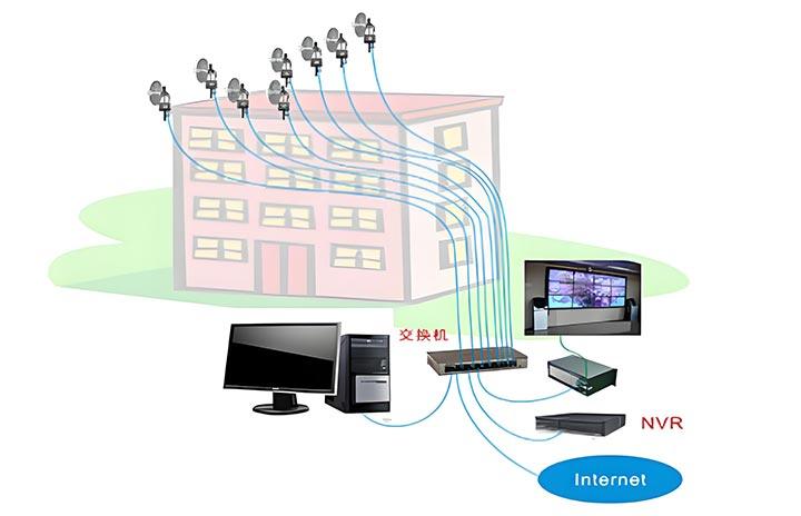 監控中心使用8臺骨干級無線設備進行接收,接收前端4個匯總點的信號。進入監控中心總交換機,可通過交換機分別接入NVR進行存儲管理,接入數字矩陣或上墻服務器進行圖像的輸出顯示,接入PC主機進行管理,接入互聯網實現遠程訪問。