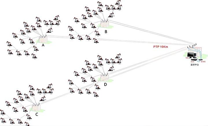 現場根據采油井場到油站匯總點的位置以及有無阻擋的情況,用無線網橋直接或者間接的方法傳輸到匯總點。例上圖中所示,11、12、13號采油井場距離油站A比較近,可以采用一對三的方式直接傳輸到油站匯聚點。