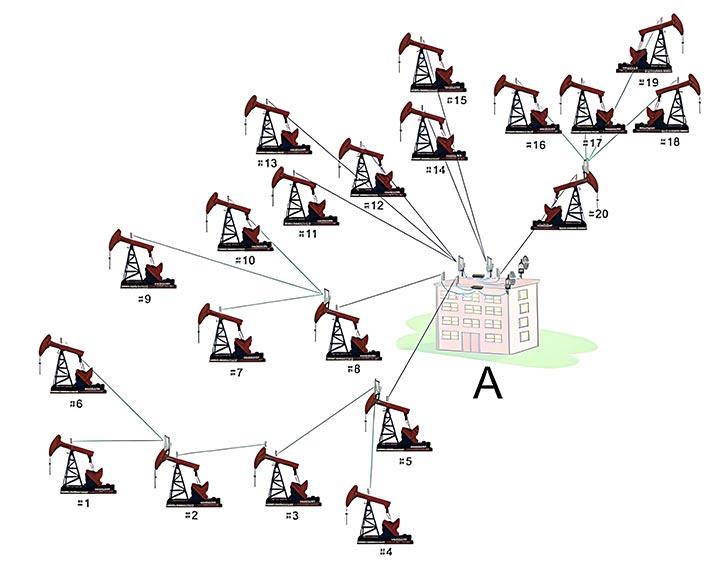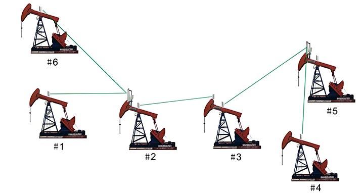 例上圖中所示,1、2、3、4、5、6號采油井場距離油站A的距離比較遠,而且還有一定的阻擋,所以可以根據情況采中分段匯總,中繼傳輸的方式傳輸到匯聚點油站A,1號和6號傳輸到2號,在2號匯總后傳輸到3號,3號和4號傳輸到5號,在5號匯總后再傳輸至匯聚點油站A。