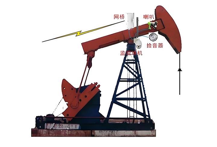 前端采油井場安裝高清網絡球機,同時在音頻輸入輸出位置接入喇叭和拾音器。網絡球機可直接接入網橋的數據接入口,圖像用無線傳輸至監控中心以后可實現監控中心對前端井場的聲音采集,并可對現場進行喊話。